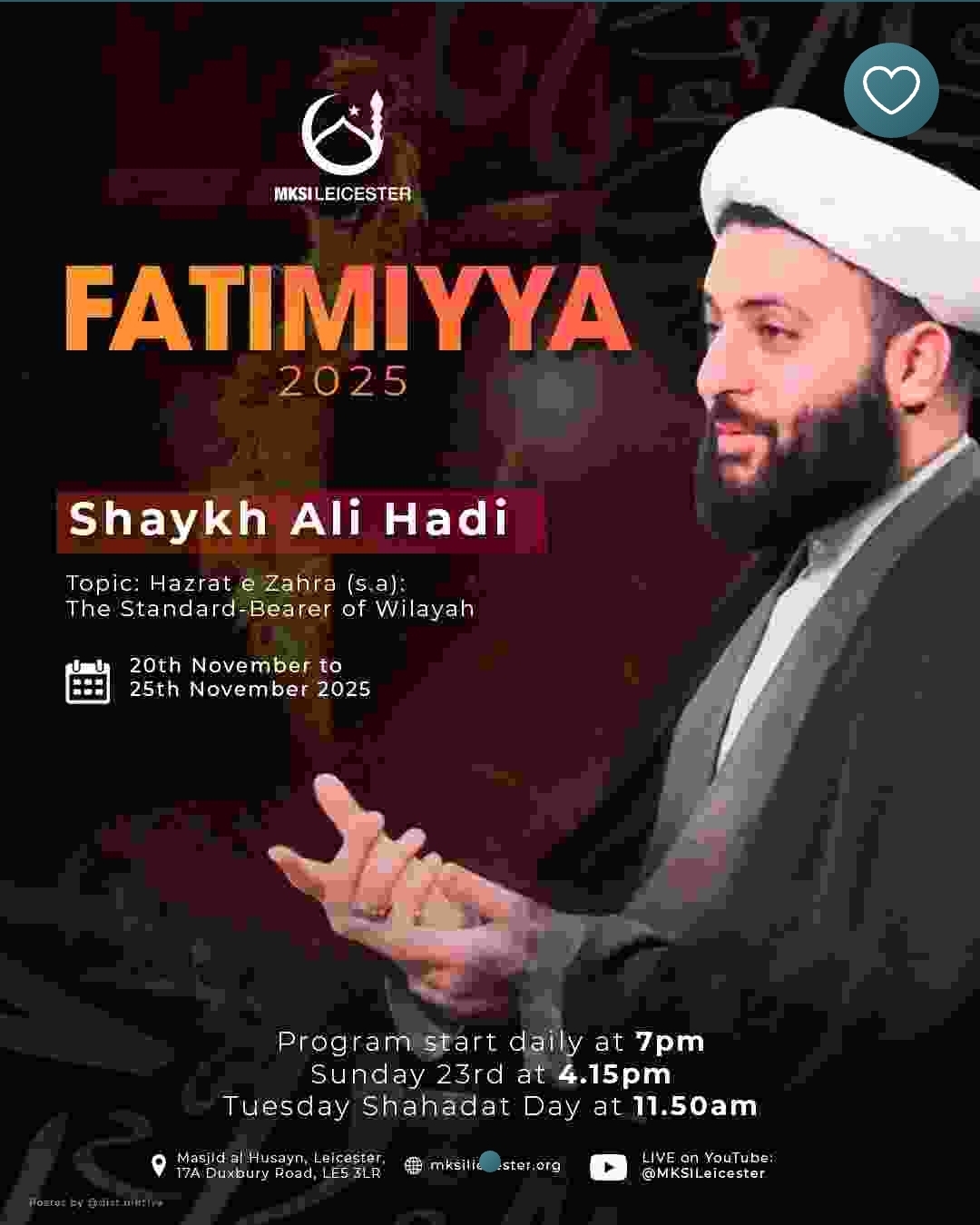 AYYAME FATIMIYYA-SHAHADAT EVE OF BIBI FATIMAH- 24/11/25 MON 24TH NOV Eve of 3rd Jamadi al Thani 1447 10.00am Ladies Majlis by Sister Uzma Naqvi 7.30pm-8.00pm Little Angels Session with Shaykh Ali Hadi (9-15 yrs Boys and Girls) in Al Zahra Centre AYYAME…