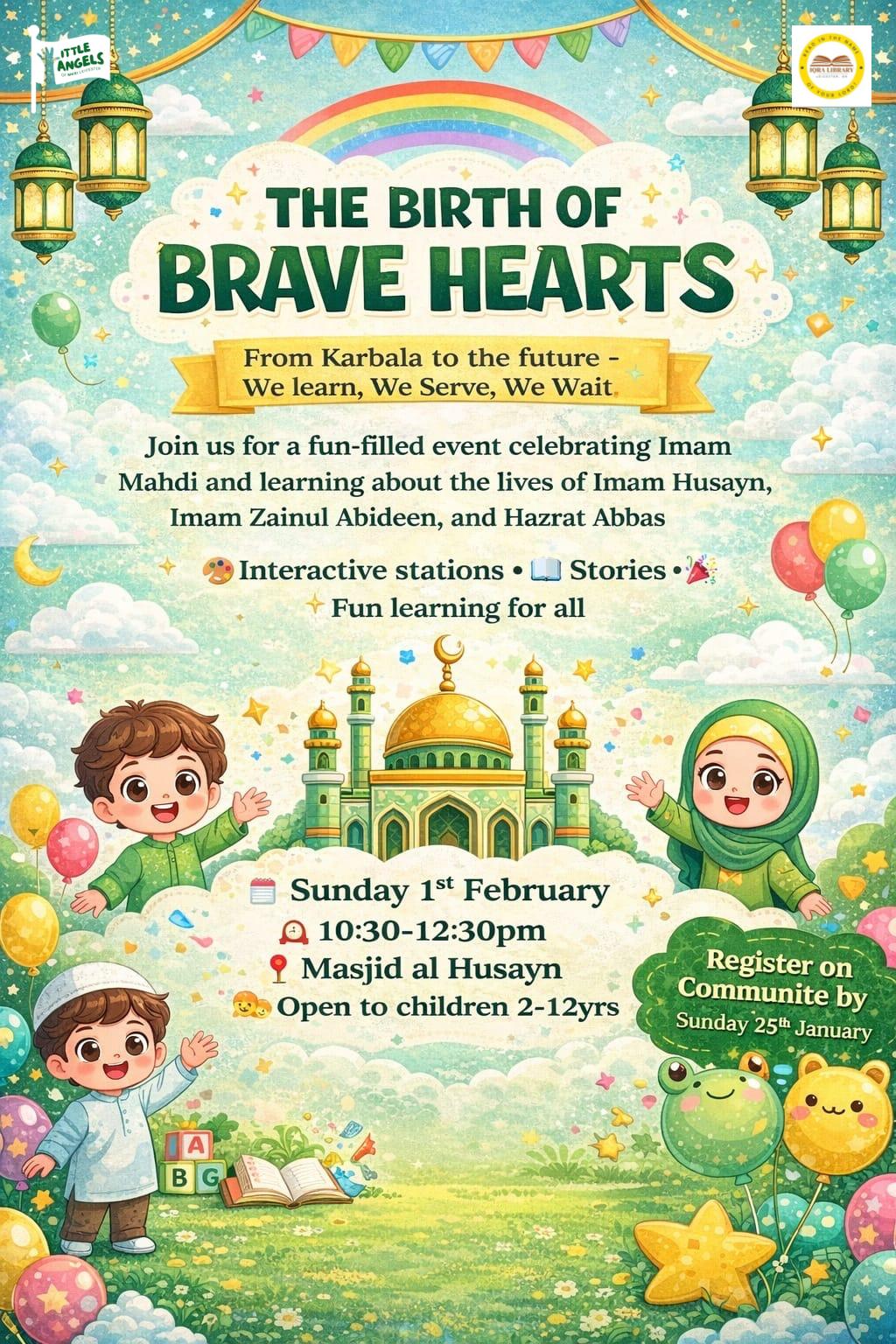 🌟THE BIRTH OF BRAVE HEARTS🌟 From Karbala to the future – We Learn, We Serve, We Wait We’re excited to invite your children to a fun-filled and meaningful event celebrating Imam Mahdi (as) while learning about the inspiring lives of Imam Husayn…