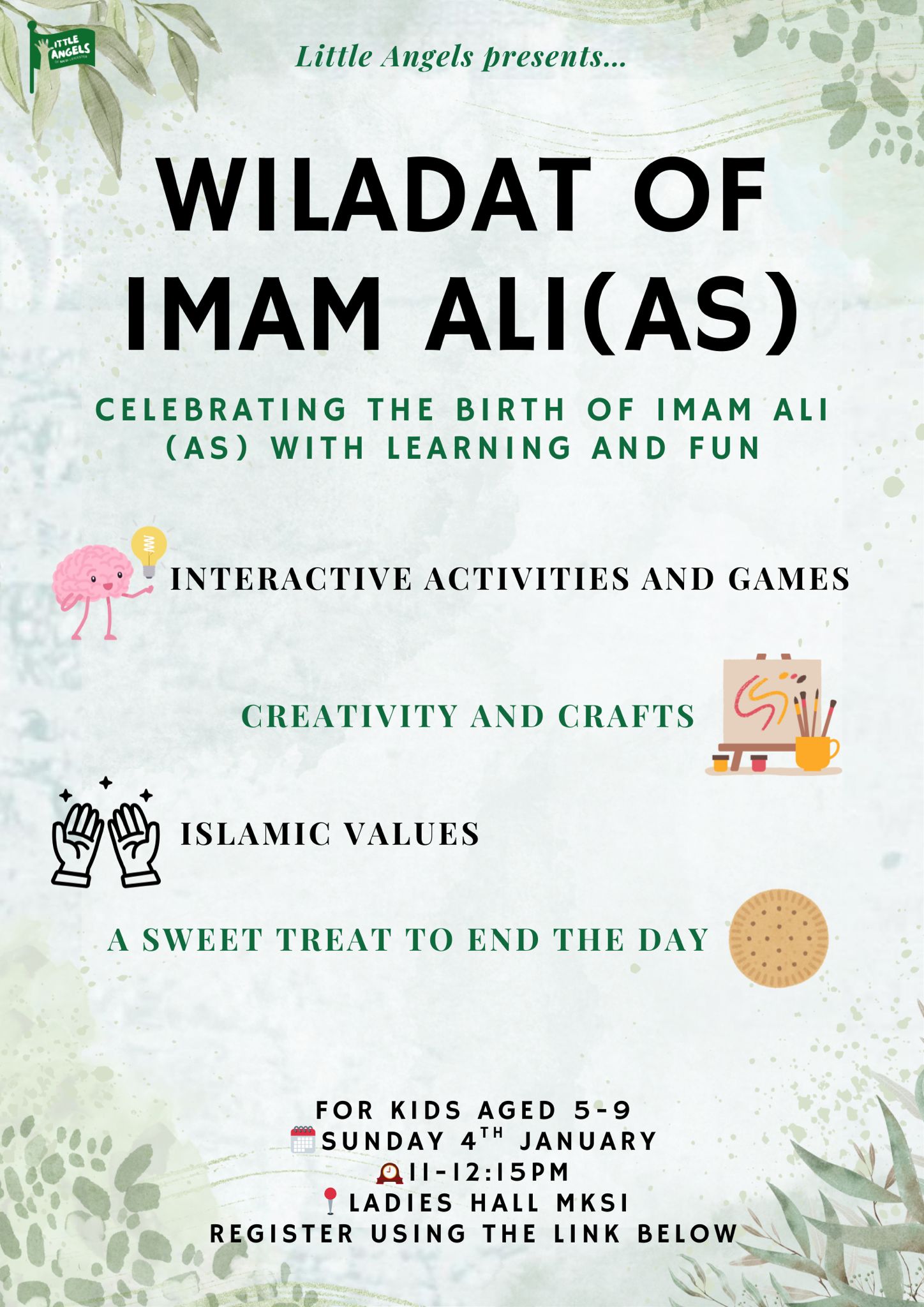 🌟 Little Angels presents 🌟 Wiladat of Imam Ali (AS) Join us for a fun and meaningful workshop for children ages 5–9 as we celebrate the birth of Imam Ali (AS) through learning, creativity, and play. 📅 Sunday 4th January ⏰ 11:00…